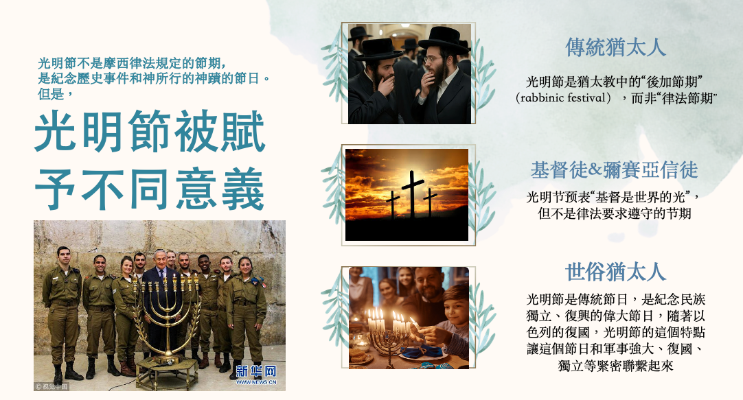 光明節不是摩西律法規定的節期,是紀念歷史事件和其中神所行的神蹟的節日。