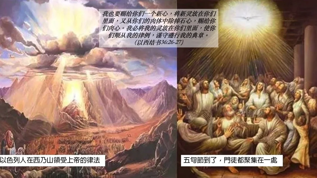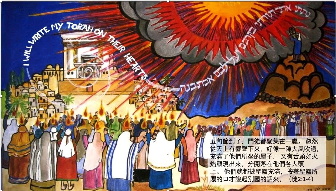 五旬節是神在曠野向以色列人說話並在西奈山頒布律法的日子。聖靈的澆灌對以色列來說是一個新的“西奈”式時刻。正如在西奈山頒布法律時一樣,聖靈的澆灌也以風和火為標志。在西奈山頒布律法時,人們無法接近火,但在五旬節,火降在了每一個人的身上。聖靈是把以色列在西奈山領受的律法寫進心靈里,靠著聖靈幫助信主的人活出律法。也成就了耶穌所說的,他來是成全律法,不是廢去(太5:17)。這批彌賽亞信徒真實進入新約。